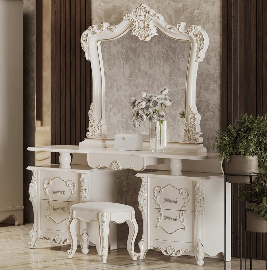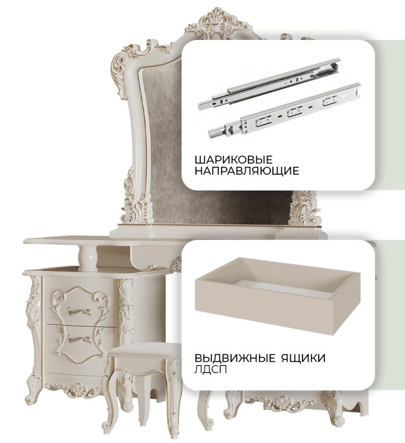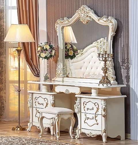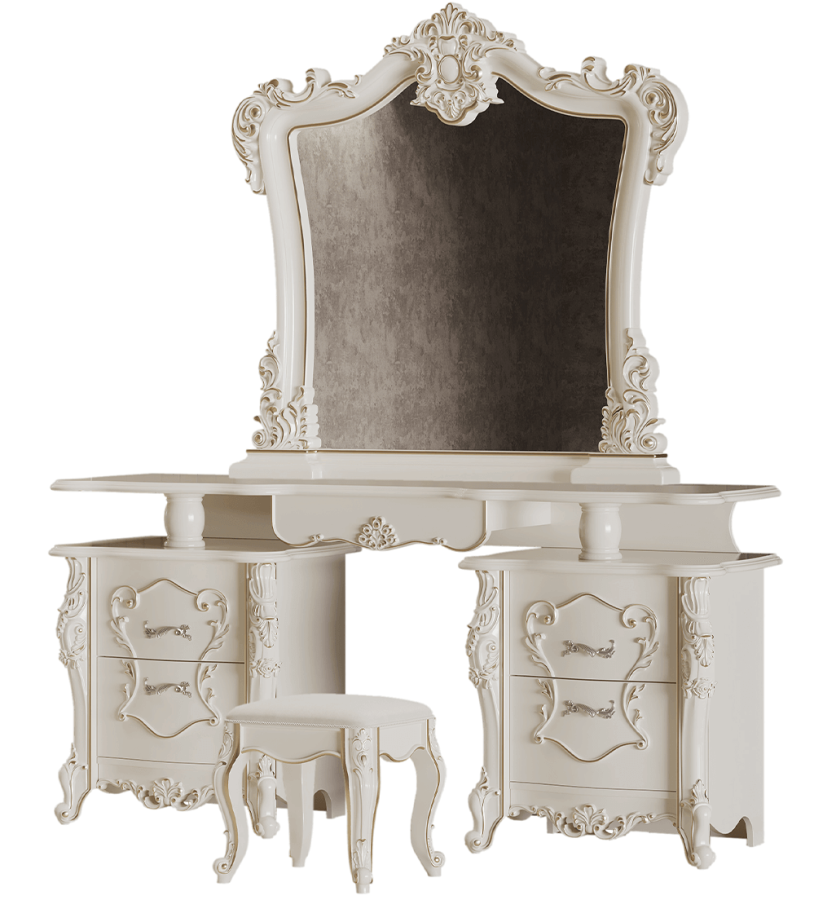 Туалетный стол "Джоконда" с выдвижными ящиками дополнен пуфом и зеркалом. Декоративные объемные элементы покрыты вручную золотой или серебряной патиной.