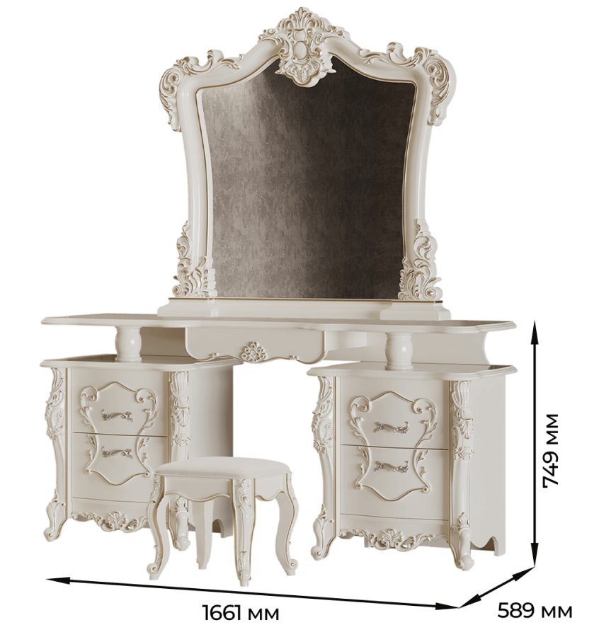 В комплект входит: туалетный стол ш1661 * г589 * в749 - 1 шт.; зеркало ш1290 * г85 * в1195 - 1 шт., высота с зеркалом: 2060 мм; пуф ш430 * г365 * в470 - 1 шт.