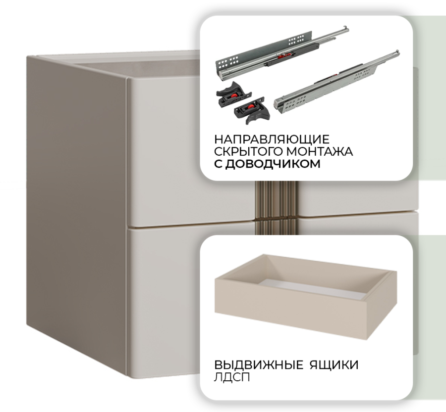 - Выдвижные ящики оснащены механизмом скрытого монтажа с несущей способностью до 30 кг.
