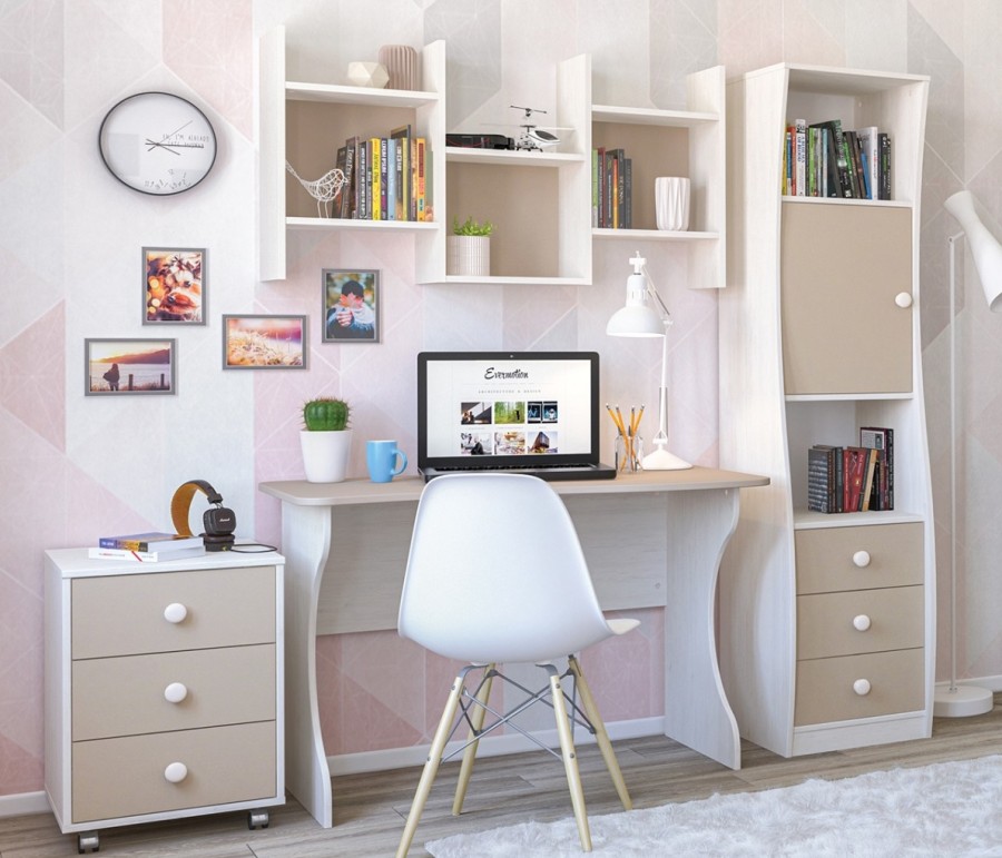 Мебель для молодежной комнаты Комби выполнена в приятных кремово-кофейных тонах, с сочетанием светлой фактуры дерева корпуса и матовых однотонных фасадов цвета «Капучино», что добавит теплоты и уюта в Ваш интерьер.
