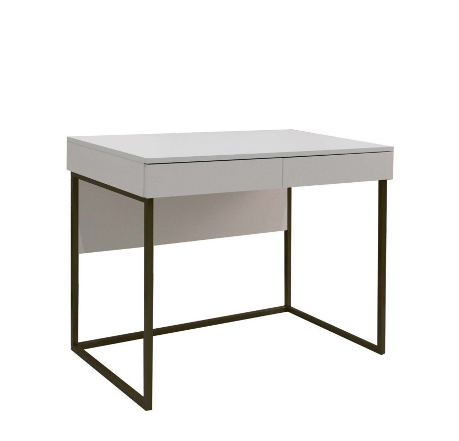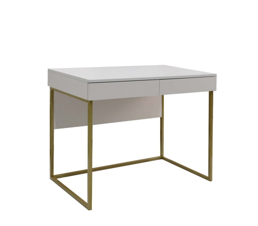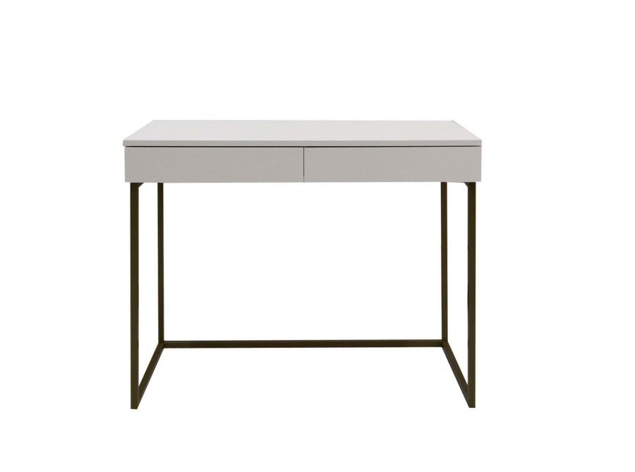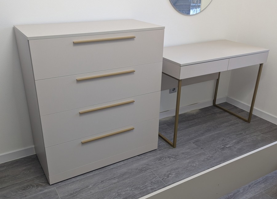 Современный лаконичный столик с выдвижными ящиками в трендовом цвете Кашемир на металлических опорах, которые можно выбрать в золотом или черном цвете.
