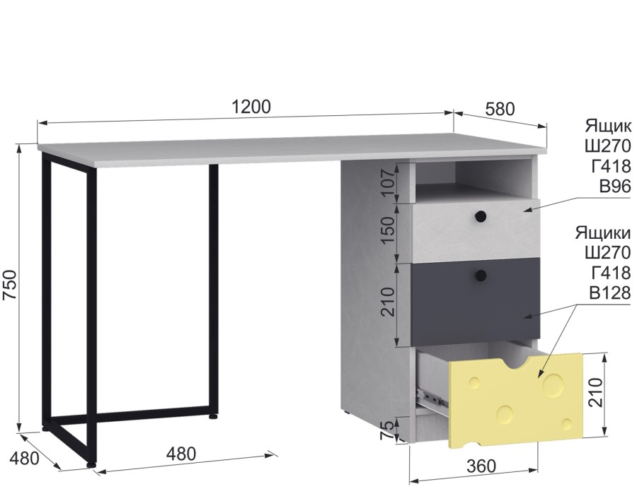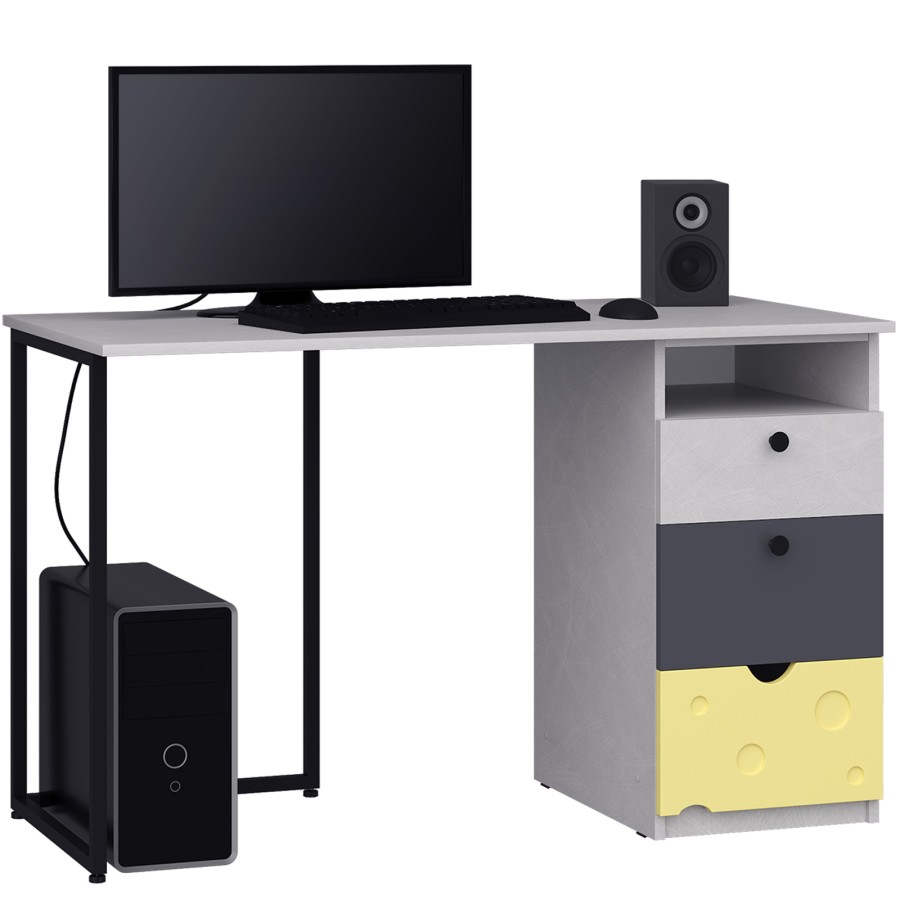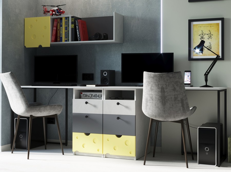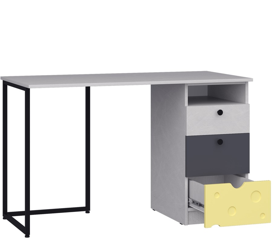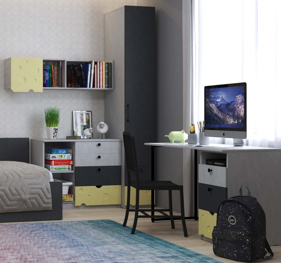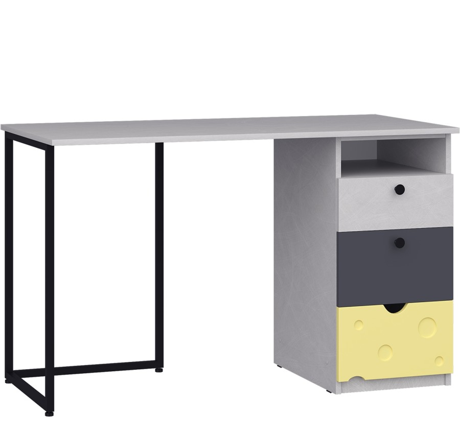 Стол письменный м.17 «Сыр» предназначен для хранения вещей в ящиках и на полках. «Сыр» — яркое и функциональное решение для комнаты вашего ребенка, которое сразу бросается в глаза фирменными желтыми акцентами и характерными «дырочками» сырной фактуры.