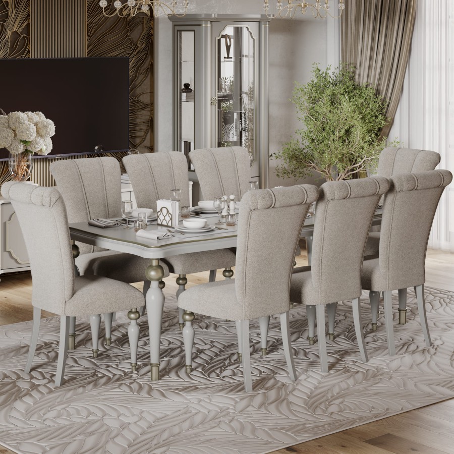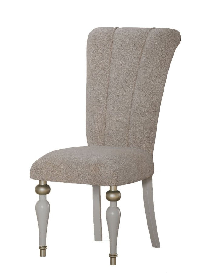Стул Мария является частью обеденной группы из этой коллекции. Декор цвета холодное золото и мягкая обивка сочетается со стилем всей коллекции.